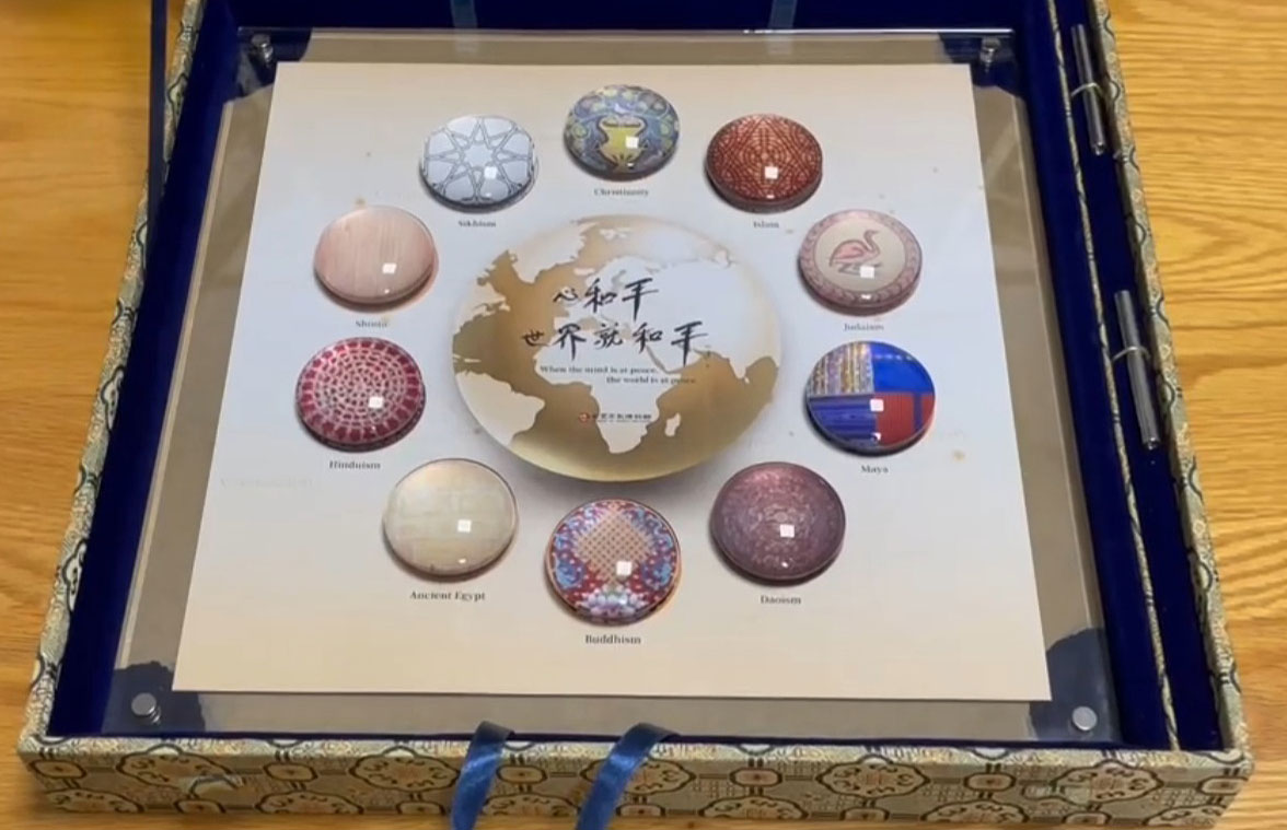 公開接見後,教宗良十四世親切地一一向全球宗教代表致意。顯月法師代表心道法師致贈禮物給教宗,這份來自世界宗教博物館的禮物融合館內十個宗教與文化的圖騰意象,象徵多元共融與世界和平的精神。