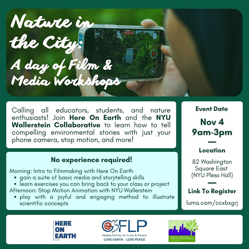 "Here on Earth", an ongoing GFLP youth program focusing on environmental education and media training, shared its recent program results with a group of environmental education experts during the New York Climate Week/Autumn in 2025, sparking animated discussions on the spot. The "Here on Earth" team members further shared common notions with Mary Leou, Clinical Professor of Environmental Conservation Education at NYU—that moving storytelling better inspires people's actions and resonance when promoting environmental issues, yet the general public lacks such opportunities. To make such learning opportunities more accessible and not confined to classrooms, Professor Leou channeled the team to collaborate with NYU's Wallerstein Collaborative for Urban Environmental Education to create the 'Nature in the City - A Day in Film & Media Workshops'.
