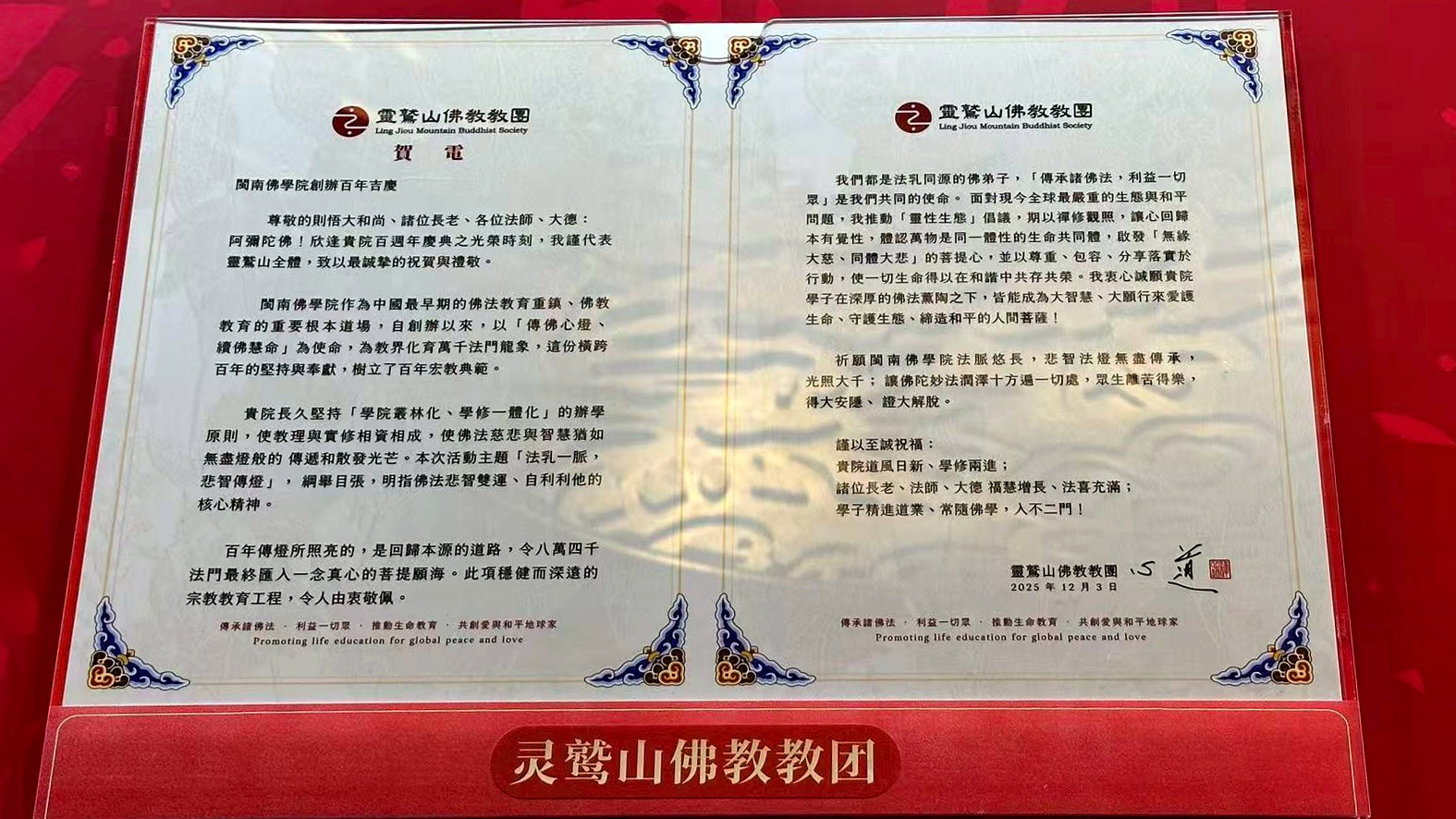 從百年前太虛大師開創新式佛教教育的宏願,到今日連結世代的持續對話,閩南佛學院的百年歷程,是佛教現代轉型的重要縮影。靈鷲山透過祝福、出席與長期交流,與佛教界共同見證此一歷史時刻,期盼在「一切智為潮」的智慧推動下,正法得以長久安住人間,照亮未來新百年的修學與弘法之路。